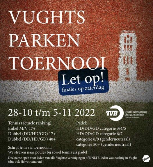 Dit jaar wordt het toernooi gehouden bij TVB! Deelname voor leden van alle Vughtse tennisverenigingen en inwoners van de gemeente Vught (incl. Cromvoirt en Helvoirt) met een KNLTB lidmaatschap. Je kunt je inschrijven via Toernooi.nl. Inschrijving sluit op zondag 16 oktober. Gezellig als je erbij bent!