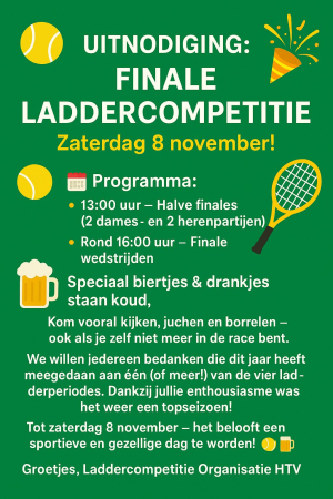 Lees meerLaddercompetitie 2025 - Schrijf je nu in! Inschrijving open tot 3-4-2025. Start 5-4-2025. Wil jij je tennisvaardigheden testen en verbeteren? Doe dan mee met onze Laddercompetitie 2025! Dit jaar spelen we in poules van 4 tot 6 spelers en krijg je de kans om elke 2 maanden opnieuw te beslissen of je wel of niet meedoet met de volgende ronde.
