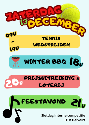 Het is bijna zover, de slotdag van de interne competitie. Op zaterdag 13 december staan de laatste wedstrijden gepland van de najaarscompetitie. We starten om 9.00 uur met de wedstrijden en de laatste speelronde is om 18.00. Kijk goed op toernooi.nl hoelaat je moet spelen.